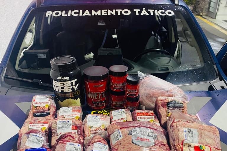 Uma equipe da ROMU (Rondas Municipais) recebeu aviso da Cecom (Central de Comunicação) para verificar ocorrência de furto no supermercado. Durante a busca pessoal, os agentes encontraram carnes e suprimentos alimentares na mochila e na motocicleta do homem, além de um desacoplador utilizado para retirar alarmes das mercadorias.