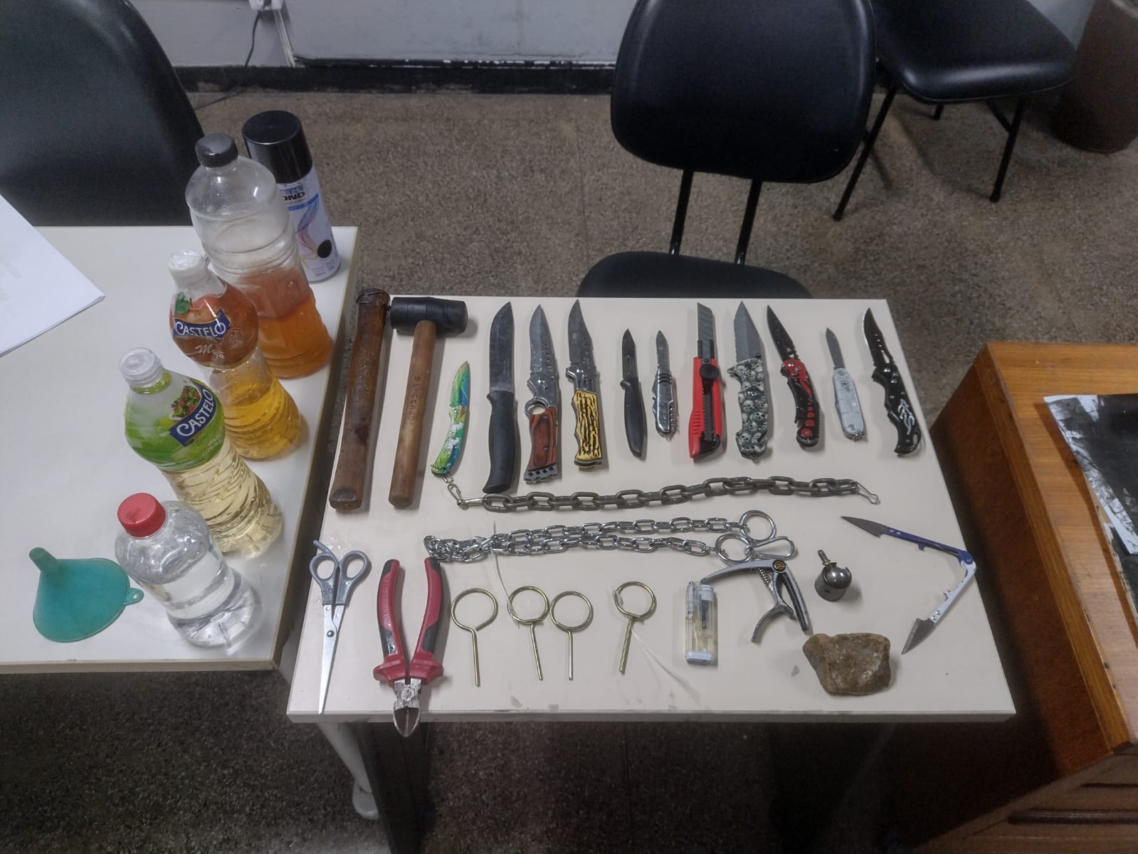Durante a revista, foram encontrados, com 13 deles, vários objetos utilizados para possível confronto, sendo eles: facas, canivetes, estilete, garrafas de gasolina, garrafas de álcool, garrafas com vinagre, pedras, martelo, porretes, tesouras, entre outros.