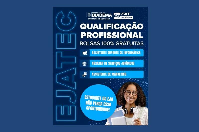 Estão abertas as inscrições para os cursos profissionalizantes promovidos pela Secretaria de Educação de Diadema em parceria da Fundação FAT (Fundação de Apoio à Tecnologia), para os estudantes da EJA e munícipes em geral. O EJATEC é uma oportunidade de qualificação profissional totalmente gratuita e feita à distância. Os cursos disponíveis são de Assistente de Suporte de Informática, Auxiliar de Serviços Jurídicos e Assistente de Marketing.