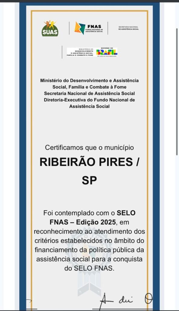 A Prefeitura de Ribeirão Pires recebeu, neste mês, um importante reconhecimento nacional pelo desempenho na área social. O município foi contemplado com o Selo FNAS 2025, concedido às cidades que se destacam na gestão e aplicação de recursos destinados à assistência social.
